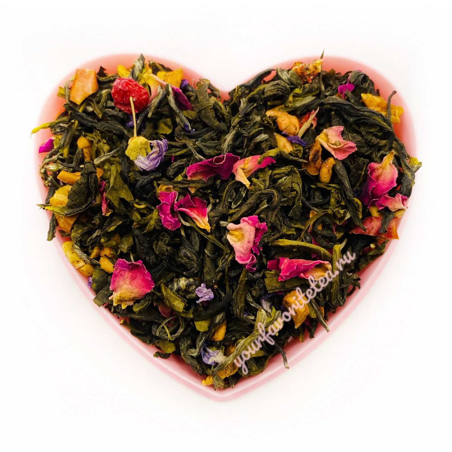 Состав: Чай зеленый китайский, кусочки яблок, цветы мальвы, лепестки розы, ягоды красной смородины, кусочки клубники, аромат лесной земляники.